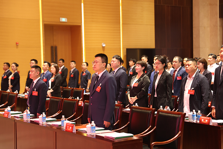 大会在庄严嘹亮的国歌声中拉开序幕,与会人员全体起立齐唱国歌,气势恢宏,激昂的旋律回荡在整个咸阳厅。