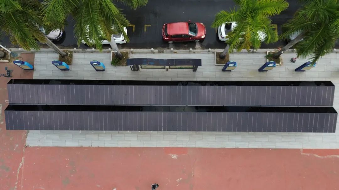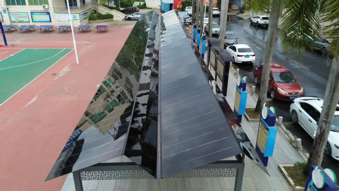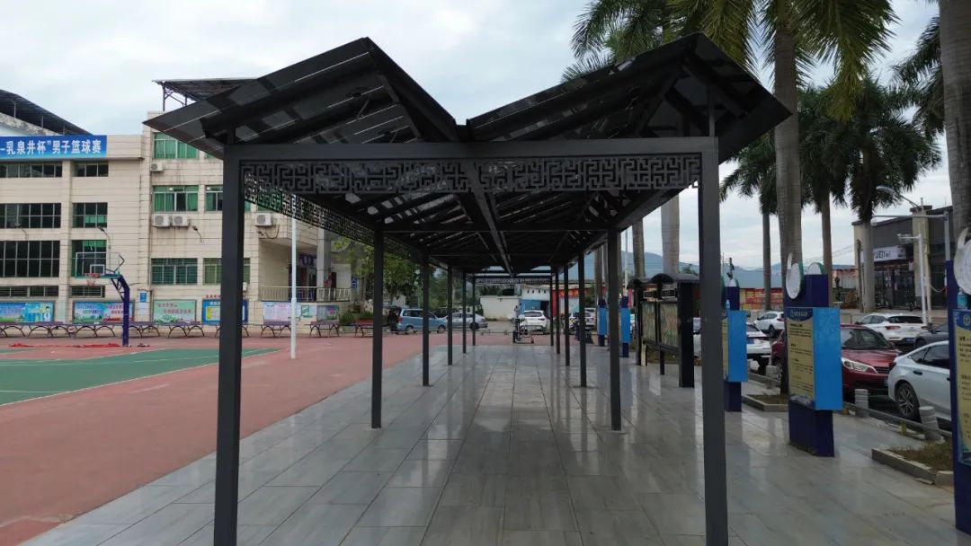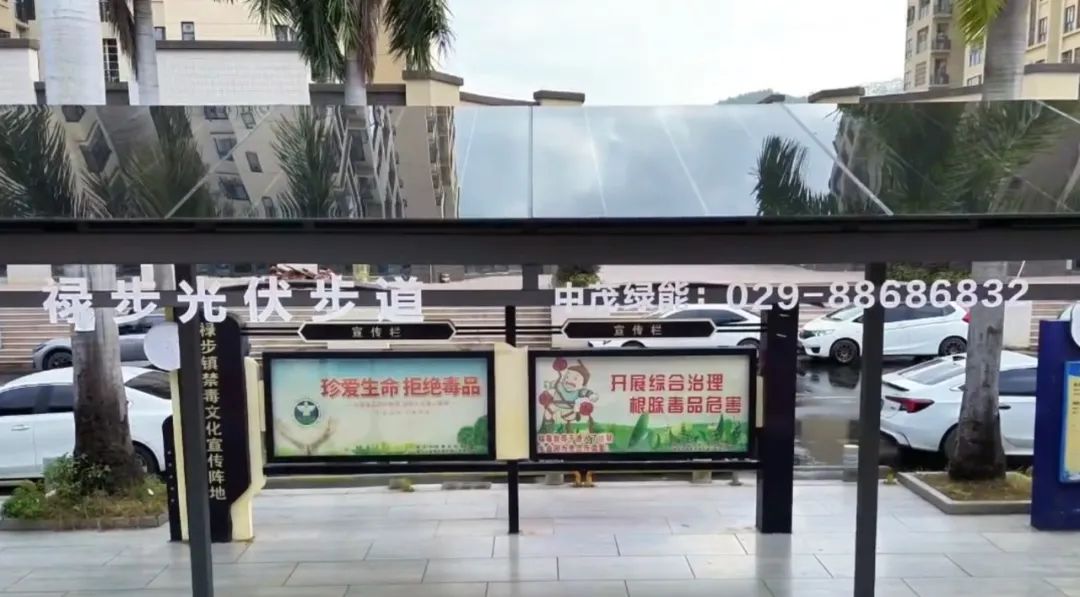 该项目同样采用中茂绿能碲化镉薄膜光伏组件,根据业主需求及场地特点,将光伏技术与走廊设计完美结合,能够最大限度地吸收阳光,为晚间当地群众的文艺娱乐活动提供稳定的电力供应;同时,光伏廊顶在夏日又能避免阳光直射带来的过热问题。该项目整个步道屋面总面积为126.72m²,光伏屋面面积为84.48m²,装机容量为11.44kW,年发电量达1.34万度。